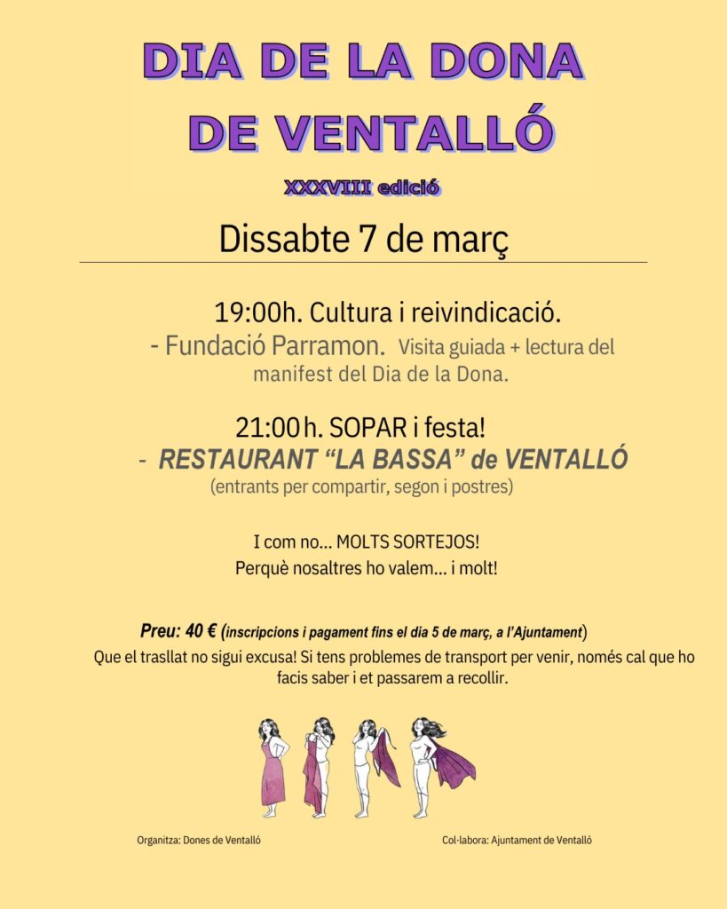 Agenda Actes previstos pel Dia de la dona 2026 07/03/2026 Aquests són els actes previstos pel Dia de la dona 2026: < Entrada Anterior