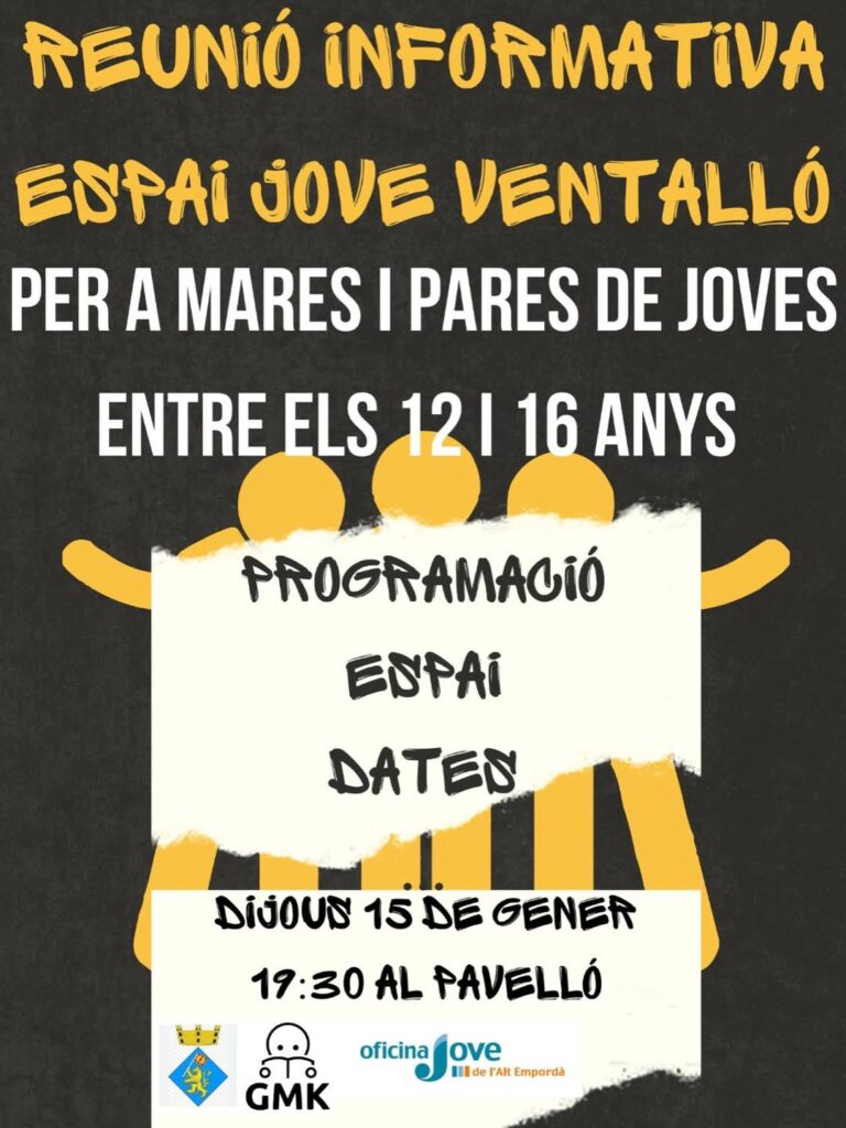 Pares i mares amb fills i filles d’entre 12 i 16 anys i joves de Ventalló, us convidem a una reunió informativa per parlar del projecte de l’Espai Jove de Ventalló per al 2026.