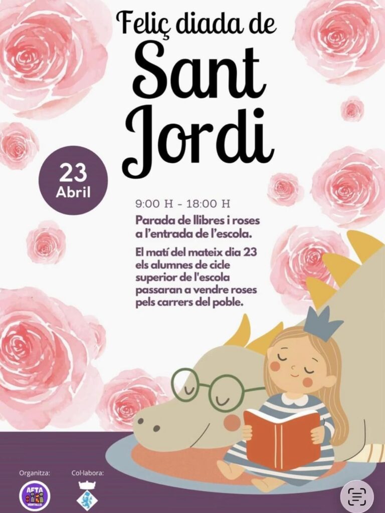 Sant Jordi arriba a Ventalló un any més, de la mà de l’Afta. Si en teniu oportunitat, passeu a comprar la rosa o el llibre a la seva parada, els beneficis van destinats a pagar les colònies de tots els nens de l’escola.