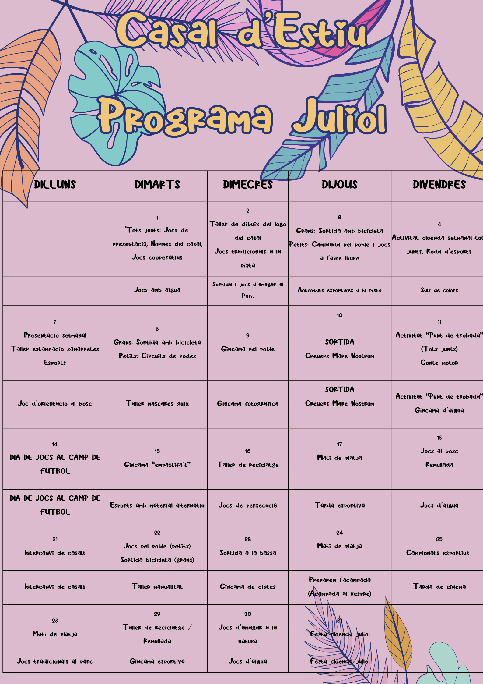 Trobareu a continuació tota la informació del casal d’estiu d’aquest any. Les inscripcions s’han de fer mitjançant aquest formulari.